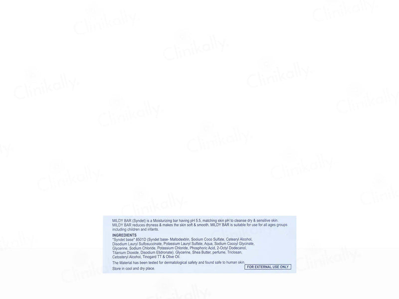 Mildy Bar is a cleansing and moisturizing bar that is formulated to manage dry skin conditions. It contains ingredients like shea butter, which helps to moisturize the skin while providing a thorough cleanse. The bar is designed to be gentle on the skin and can be used during bathing to help maintain the skin's moisture balance.